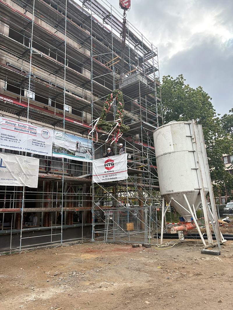 Nachdem wir im Februar den Rohbau des ersten Bauabschnitts gefeiert haben, folgte nun das Richtfest für den zweiten Bauabschnitt am Campus Ausschläger Weg. Gemeinsam mit SBH | Schulbau Hamburg, den Entwurfsarchitekten, unserem Planungsteam sowie den vielen Handwerker:innen wurde dieser wichtige Meilenstein begangen. Im zweiten Bauabschnitt entsteht ein separates Gebäude für die Berufsschule BS 12 mit einer offenen Eingangshalle, einer modernen Mensa samt Produktionsküche sowie vielseitigen Veranstaltungs- und Praxisräumen. Die BS 12 wird hier künftig über vier Geschosse hinweg optimale Bedingungen für Ausbildung und Lehre erhalten. Ergänzt wird der Campus durch zwei Wohngebäude, die rund 180 Auszubildenden ein Zuhause mitten auf dem Gelände bieten. Mit dem gesamten Ensemble wächst bis 2026 ein neuer Bildungsstandort für die Berufliche Hochschule Hamburg (BHH) sowie die Berufsschulen BS 09 und BS 12. Unser Büro ist mit der Ausführungsplanung betraut und arbeitet hier erfolgreich im Team mit HTG Hoch- und Tiefbau Gadebusch sowie den Entwurfsarchitekten zusammen. Nach dem feierlichen Richtspruch klang das Richtfest bei Begegnungen und Gesprächen in entspannter Atmosphäre aus. Ein herzliches Dankeschön gilt allen Beteiligten, die diesen Erfolg möglich gemacht haben.